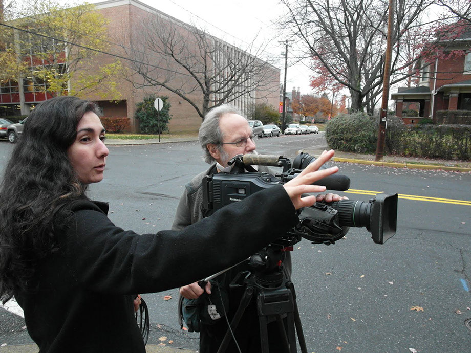 Production still - Director Carolina Loyola-Garcia and Cinematographer Mark Knobil shooting in Lancaster, PA.